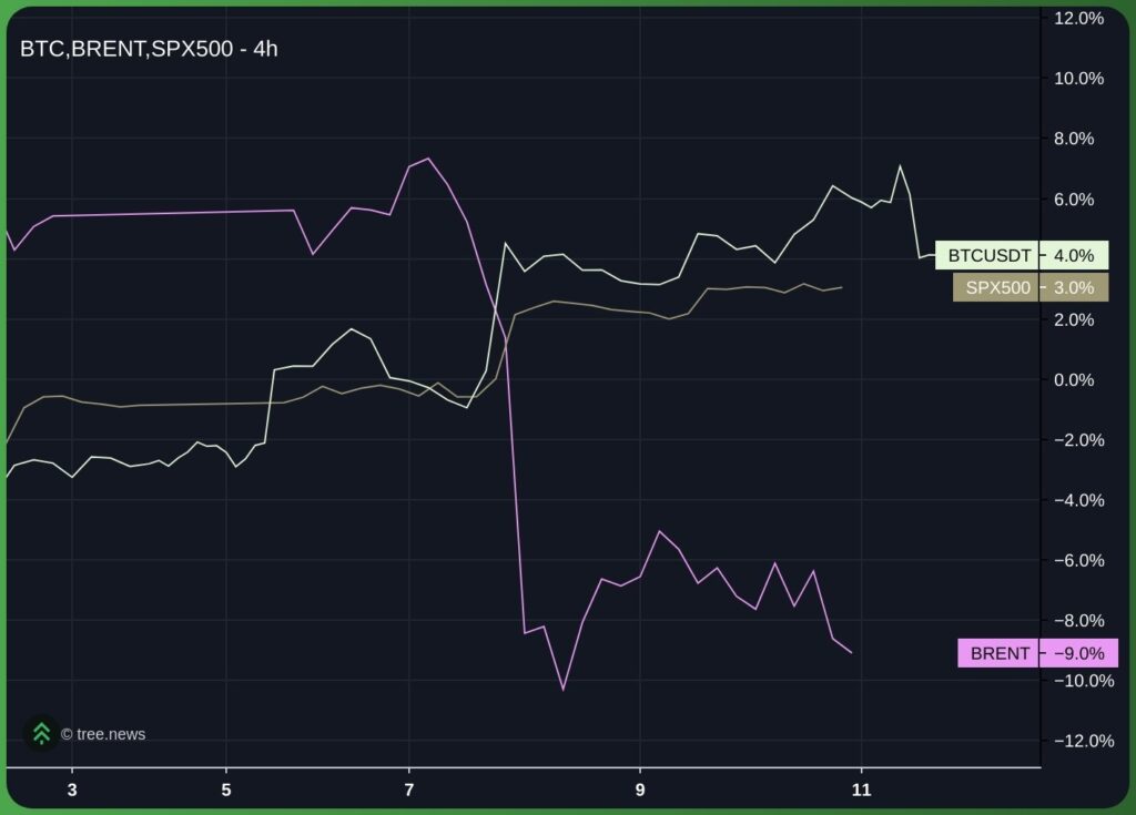 圖 4. BTC、布倫特原油及標普 500 自停火消息以來的相對表現(來源:Tree)