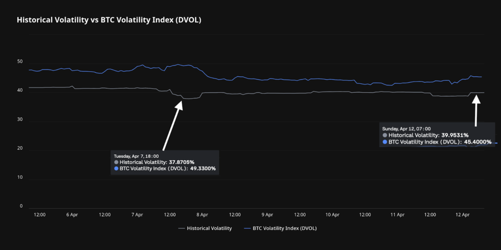 圖 3. 比特幣隱含波動率 vs. 實現波動率(來源:Deribit Metrics)