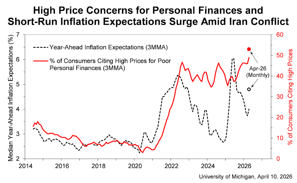 消費支出上升而實際收入下滑的局面,在核心通膨持續偏高的背景下尤為令人擔憂。核心 PCE 通膨維持 3.7% 的年化速率,表明通膨壓力並不局限於能源等波動性品類,而是更廣泛地嵌入整體經濟。這一態勢提升了通膨向服務業及其他核心產業擴散的風險,並可能延伸至交通、旅遊、食品等多個領域。此類第二輪效應對物價的推升影響往往更為深遠且持久。與此同時,通膨預期走高加劇了社會對購買力下降的憂慮,導致消費者情緒持續惡化。