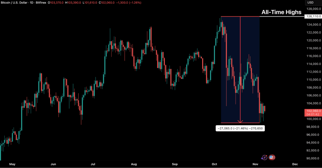 Bitcoin was down by as much as 21.46 percent from its October all-time high last week, briefly dipping below the psychological $100,000 mark to a low of $99,045. Such a fall likely signifies the establishment of a new consolidation base rather than the onset of a cascading sell-off. Historical market and on-chain data suggest that the current price action closely mirrors prior mid-cycle corrections, where structural participants stabilise exposure and capital rotates within the ecosystem before broader uptrend continuation. The failure to hold above the short-term holders’ (STH) cost basis of $112,500 has led to a controlled decline, bringing BTC back below that key level and confirming the anticipated retest of deeper structural supports.