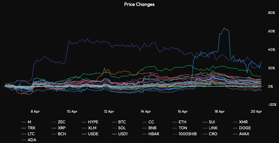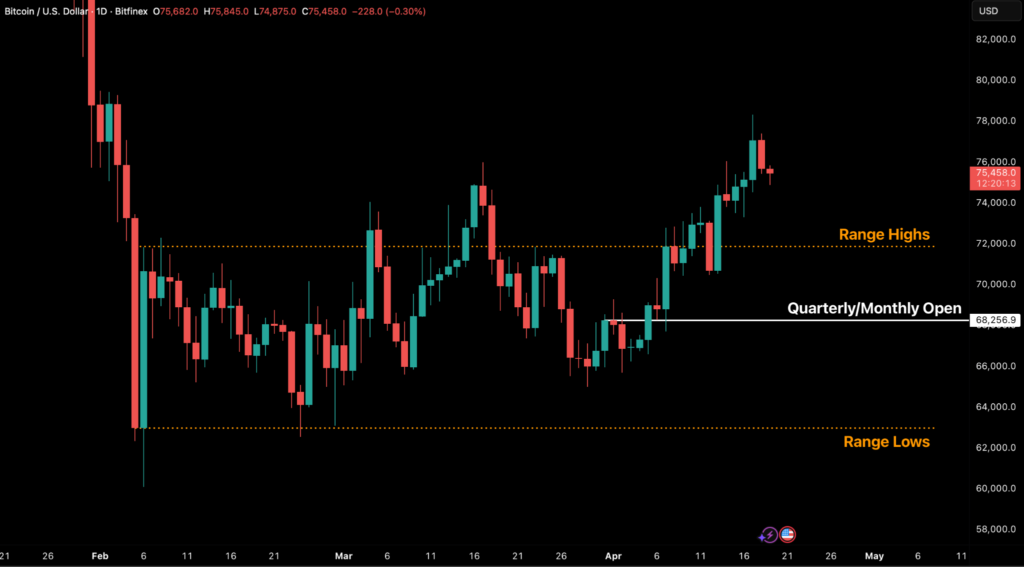 Bitcoin started last week strongly, posting a 5.2 percent advance on Monday, April 13th, and decisively confirming a breakout above established range highs. The weekly close was registered near $74,000, capping off a five-day sustained ascent from the Monday low of $70,470 to a Friday peak of $78,328, an 11 percent peak-to-trough price fluctuation in a single trading week. The price then slightly retraced as the US-Iran ceasefire seemed to end and speculative positioning ahead of the new week came in.