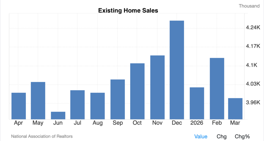 Data from the National Association of Realtors showed that Existing Home Sales declined to a nine-month low in March, reflecting weaker demand across all regions. The report highlighted how rising mortgage rates and declining consumer confidence are affecting purchasing decisions, despite earlier improvements in affordability. Existing home sales fell 3.6 percent to an annual rate of 3.98 million units, indicating that contracts signed earlier in the year did not translate into sustained market momentum.