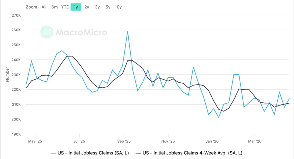 The labour market is the single most important variable holding the resilience thesis together. The 13-week moving average of initial jobless claims tracked by the US Department of Labour sits near 214,000, indicating steady employment conditions and very low layoff activity. Hiring has slowed materially, but firings have slowed in parallel. This has been characterised as a “low-fire, low-hire” regime, in which firms are reluctant to expand headcount but equally reluctant to release existing staff into a market they are not confident they could re-hire from later.
