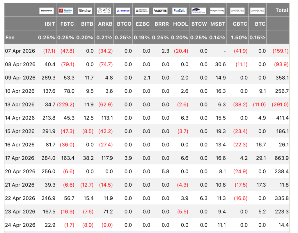 However, BTC again outperformed equities and saw $2.1 billion in net spot ETF inflows over eight consecutive sessions through April 23, the cleanest institutional bid since February.