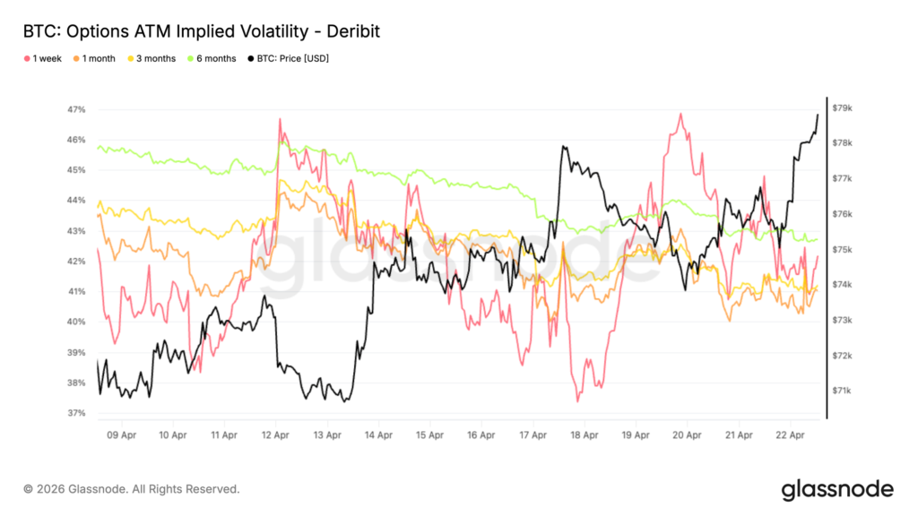 Derivatives and volatility positioning further reinforce this cautious outlook. Implied volatility continues to compress across the curve, even as price trends higher, signalling a lack of urgency and limited conviction among market participants. The combination of strong institutional inflows, rising sell-side pressure, and muted volatility suggests that the current move is more consistent with absorption than expansion. As a result, the path of least resistance in the near term is likely consolidation or a pullback toward the $75,000 region, with a decisive break above $80,000 required to confirm a more durable bullish regime.
