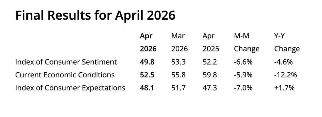 Sentiment fell across every demographic: income, age, and political bracket in the survey, ruling out a partisan or cohort-specific explanation. The proximate cause is the energy pass-through from the US-Iran conflict: national average retail gasoline has held above $4 per gallon throughout the month, with diesel above $5 per gallon, and households remained focused on the inflation fallout even after a ceasefire was announced. This pattern, which reflects sentiment lagging diplomatic de-escalation by months, is consistent with prior energy-shock episodes.