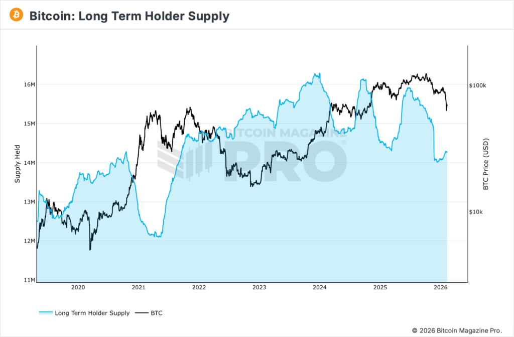 Previously this metric continued to fall as whales and long-term holders, often overlapping cohorts of investors, distributed their holdings moving 13.5% lower between July-December 2025. Currently the metric has moved to 14.3 million BTC after bottoming in mid December.