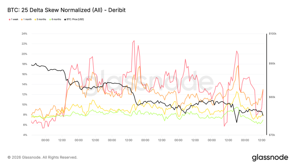 Options positioning continues to reinforce the market’s defensive posture. Downside skew has steepened once again, reflecting a renewed bid for protective puts relative to calls. Even with price holding above the $73k region, participants are prioritising hedging against further gap risk rather than positioning for a meaningful relief rally.