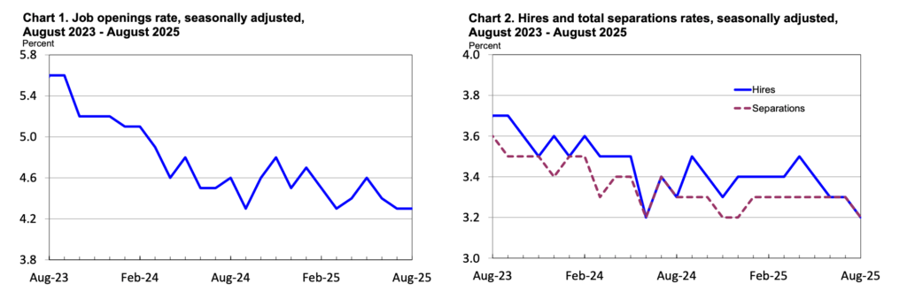 Nền kinh tế Mỹ lại đang cho thấy dấu hiệu yếu đi, khi dữ liệu thị trường lao động phản ánh đà tăng chậm và sự bất ổn ngày càng lớn. Báo cáo JOLTS tháng 8 cho thấy số lượng việc làm mở giữ ổn định ở 7.2 triệu, nhưng tỷ lệ tuyển dụng giảm mạnh, trong khi tỷ lệ nghỉ việc tự nguyện tiếp tục giảm tháng thứ ba liên tiếp – biểu hiện cho tâm lý yếu đi của người lao động.