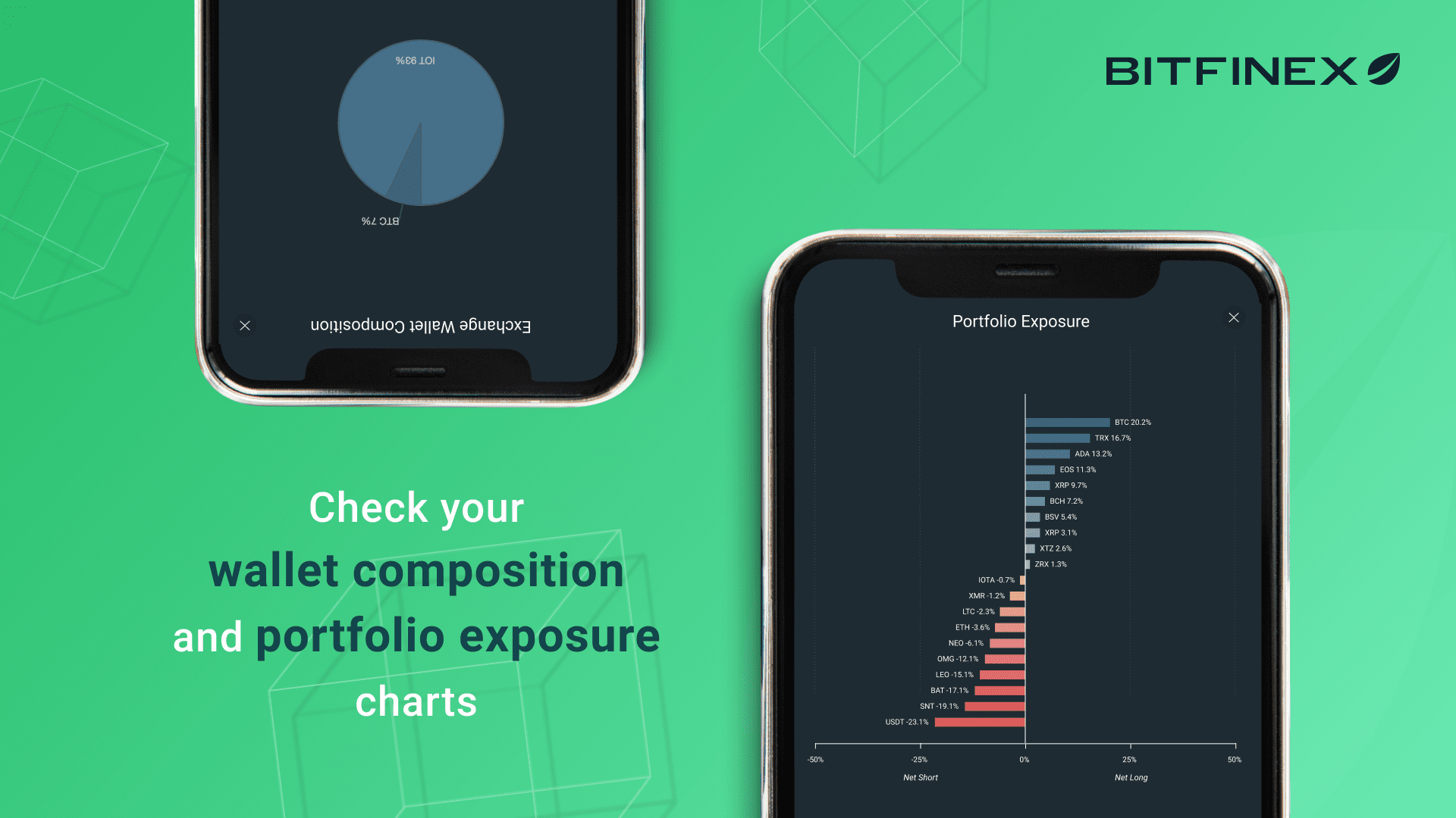 - User’s Exchange Wallet Composition and Portfolio Exposure Chart are shown in Bitfinex Pulse as pie and bar charts, respectively