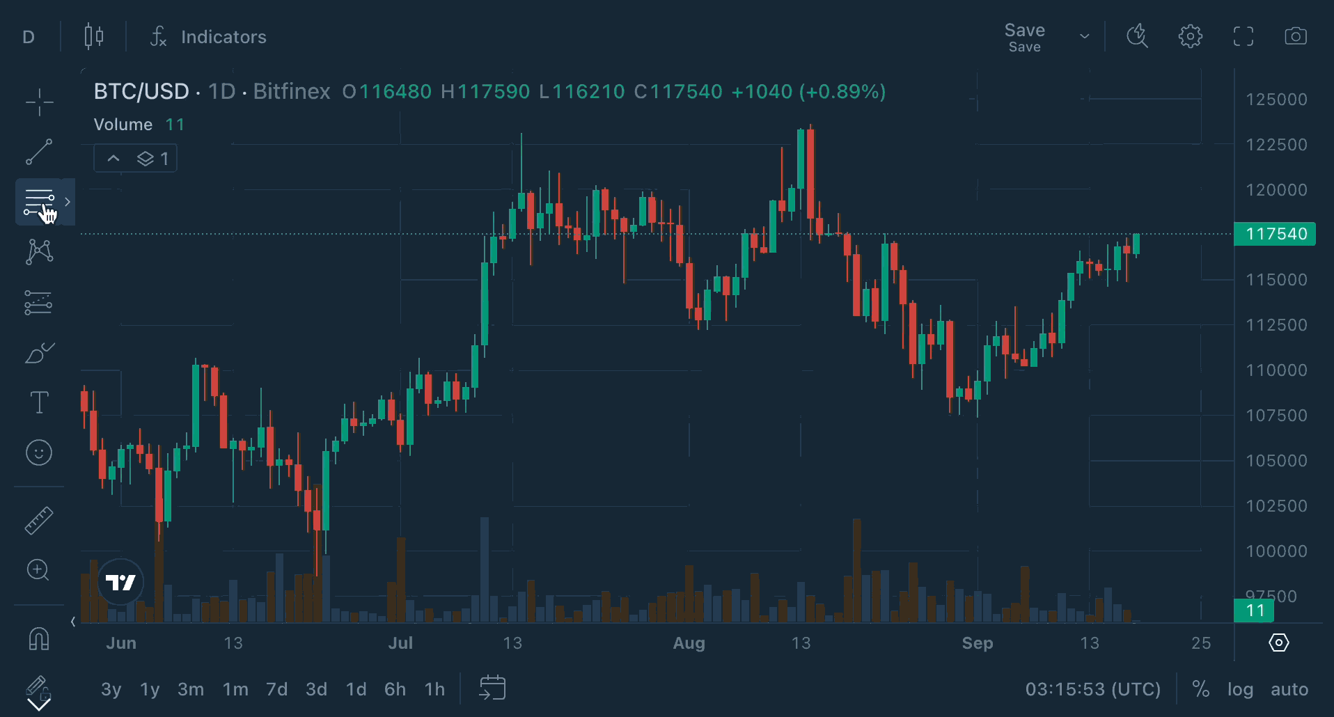 - On the left toolbar, look for the “Fib Retracement” tool (it looks like 4 horizontal lines)