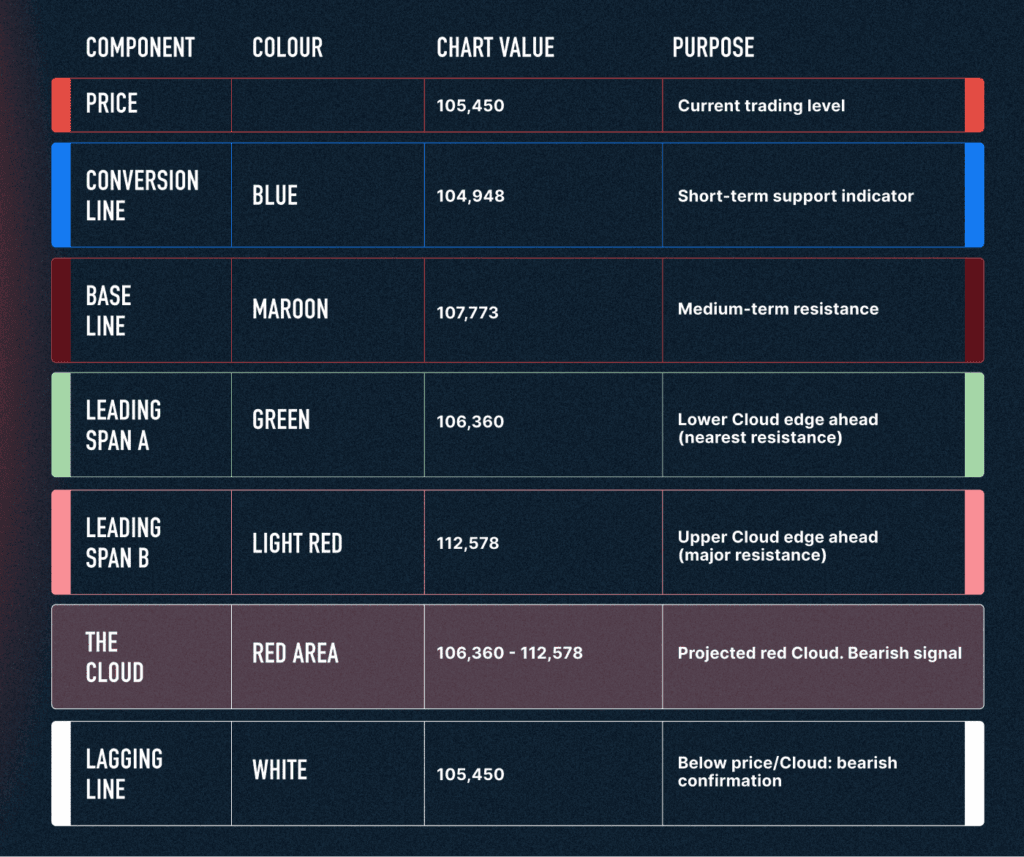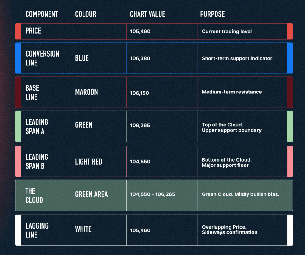 The Conversion Line (104,948) sits below the Base Line (107,773), confirming short-term bearish momentum. The Lagging Line below both price and Cloud confirms that the broader trend is still down, and buyers haven’t taken control yet.