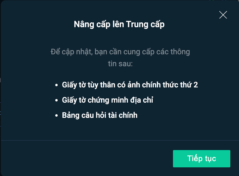 Giấy tờ được yêu cầu để lên xác minh Trung Cấp như sau: