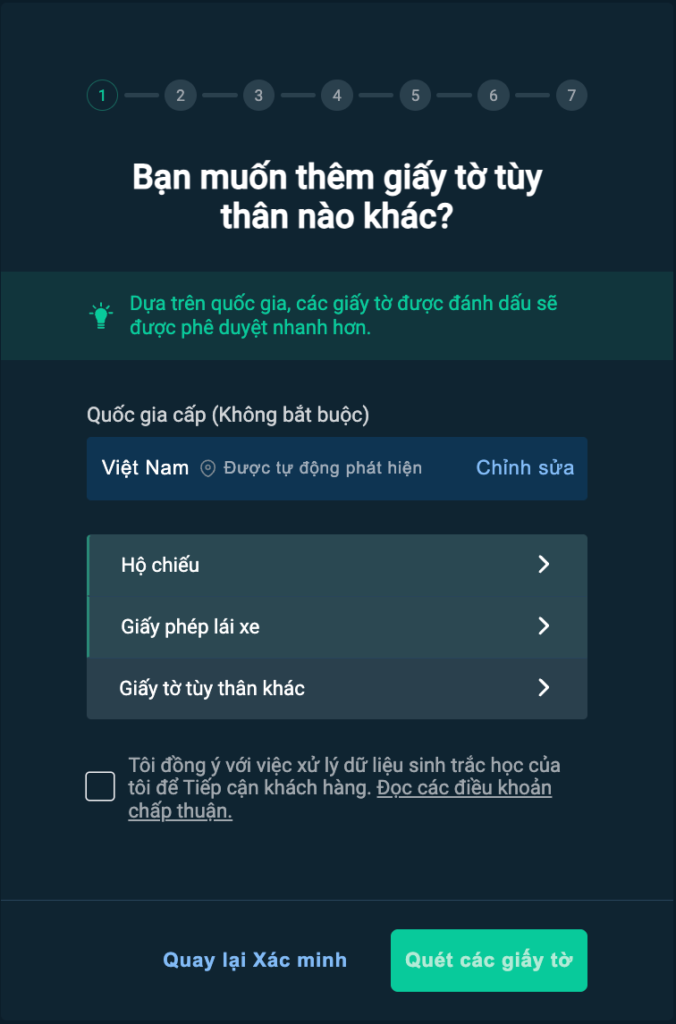 Chọn loại giấy tờ tùy thân thứ 2 mà bạn có: Hộ chiếu/Giấy phép lái xe,…