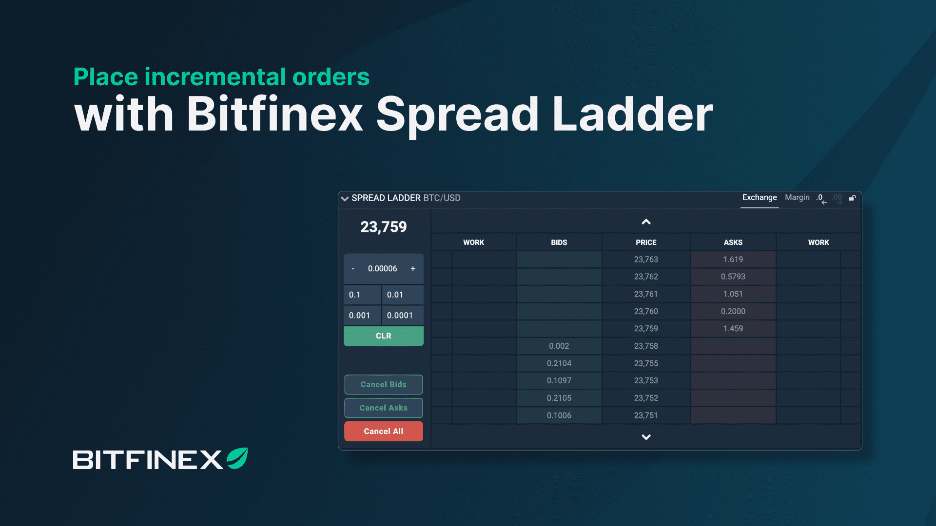 Bitfinex is proud to announce our new spread ladder trading feature, which lets traders easily execute large trades in a single transaction without having to take multiple positions to hedge risk, and assists in achieving an average entry and exit price.