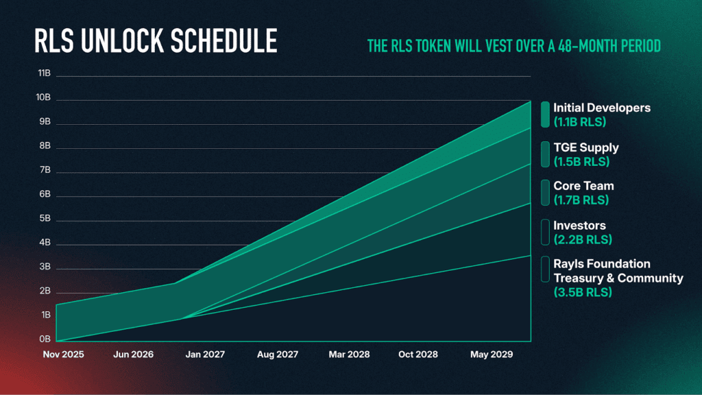 At the Token Generation Event (TGE), approximately 1.5 billion RLS (15% of total supply) entered circulation. The remaining supply is allocated across ecosystem development, contributors, investors and community initiatives, with long-term vesting schedules designed to align incentives with sustainable network growth.
