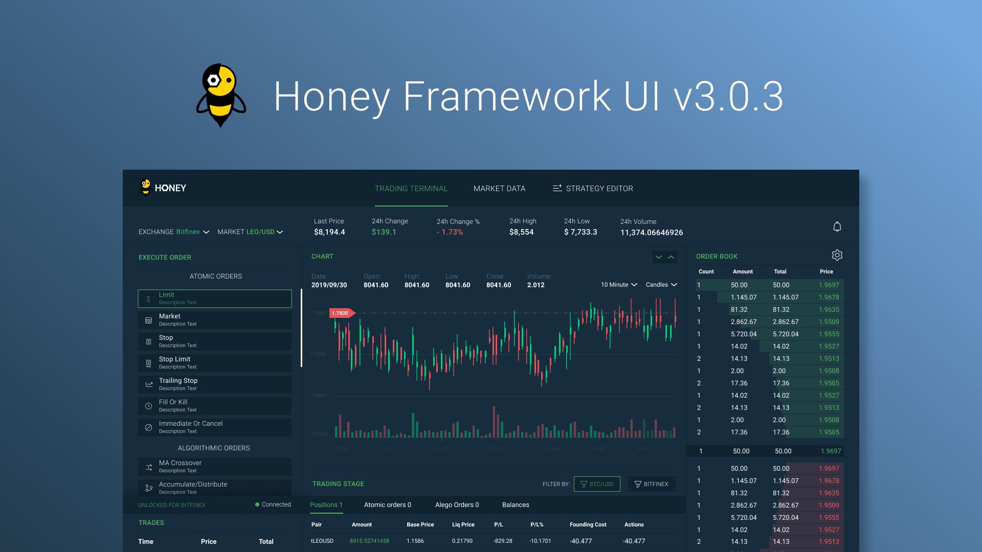 As well as algorithmic orders, the Honey Framework is capable of managing and executing trading strategies. With over 20 different TA indicators built-in and custom backtesting, the strategy execution engine is perfect for all kinds of strategies such as arbitrage, market making, momentum, directional and a lot more.